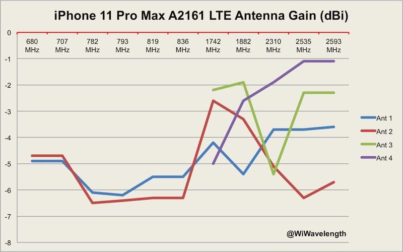 对比去年的iPhone XS Max,采用新天线材料的iPhone11 Pro是有点进步。对比之下去年XS Max的天线增益真的可以用惨不忍睹来形容