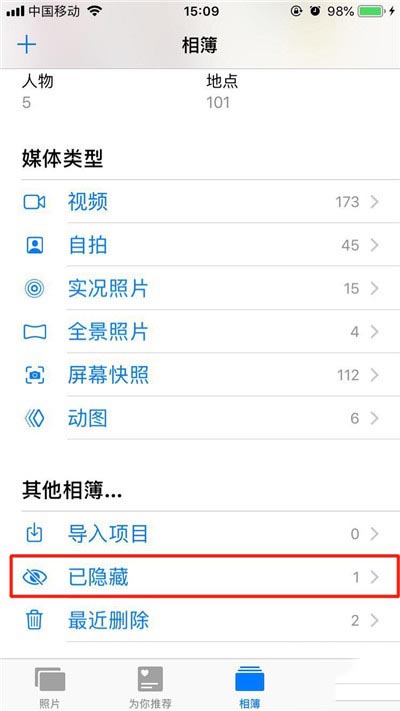 3、选择【隐藏】,这样照片就没办法在资料库显示了,但是可以在“已隐藏”相簿中找到。在这里也可以选择恢复,之后就能够正常浏览照片了。