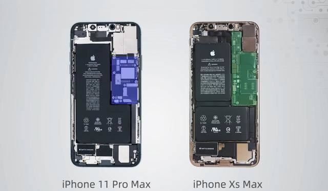 首先,我们通过iPhone 11 Pro Max和去年的iPhone Xs Max拆机图对比可以看出,iPhone 11 Pro Max电池由上一代的分割式便成了一体式。在主板上,iPhone11 Pro Max采用的双层主板设计,这可能是导致热量难以散发出去的主要原因;且A13处理器采用了全新的架构和制程工艺,发热量也进一步加大,从而导致机身发热。