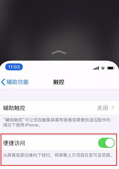 便捷访问功能在默认情况下处于关闭状态。要打开这项功能,请前往“设置”-“辅助功能”-“触控”,轻点“便捷访问”,然后打开它。