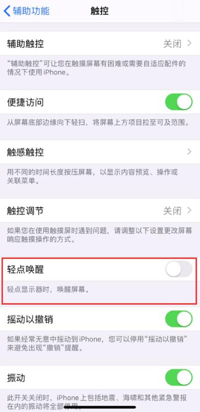 打开 iPhone “设置”-“辅助功能”-“触控”,找到轻点唤醒并进行关闭或开启。