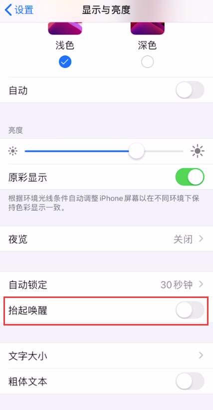 打开 iPhone “设置”-“显示与亮度”,点击“抬起唤醒”后面的按钮进行开启或关闭。