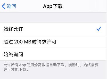 当您使用流量下载较大的应用时,可能会遇到提示,如果流量足够用,想要取消该提示,可以前往 iPhone “设置”-“iTunes Store 与 App Store”-“App 下载”,并在此界面中选择“使用允许”即可。