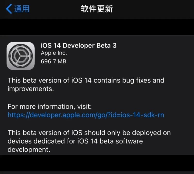 iOS14beta3升级更新包大小为698MB。升级更新了加入了一些全新的功能,不过变化已经比较小了。