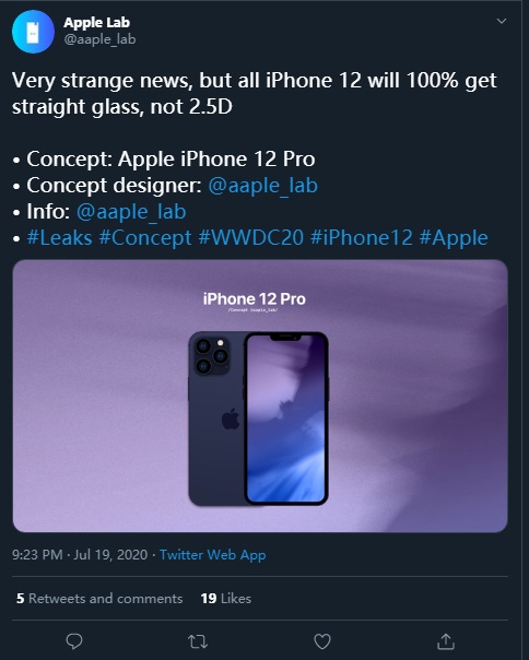 据知名爆料者 @Apple Lab 7月19号称,iPhone 12 所有型号都将采用纯平面玻璃设计。