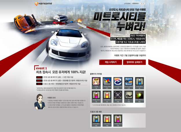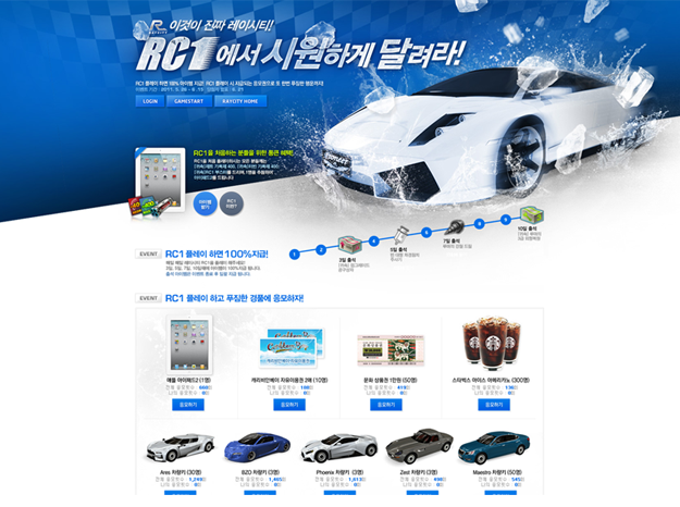 上图,将赛车在赛道上疾驰的场面置放到页面上作为背景,虚化的大城市,放大的赛道,飞奔的赛车……就像此刻坐在电脑前玩赛车,左手正紧紧按着W、A、S、D键一样。让用户身临其境,完全抓住了对方眼球。