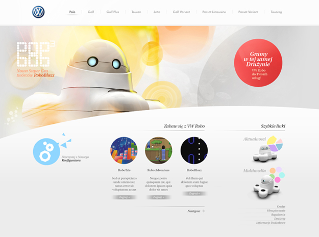 上图中,大众的logo和焦点图中的机器人产品,全部由曲线组成,这种情况下,用曲线来分割背景和焦点就显得理所当然了,画面中曲线合理的运用也提高了层次感,机器人和红色标题都更突出。