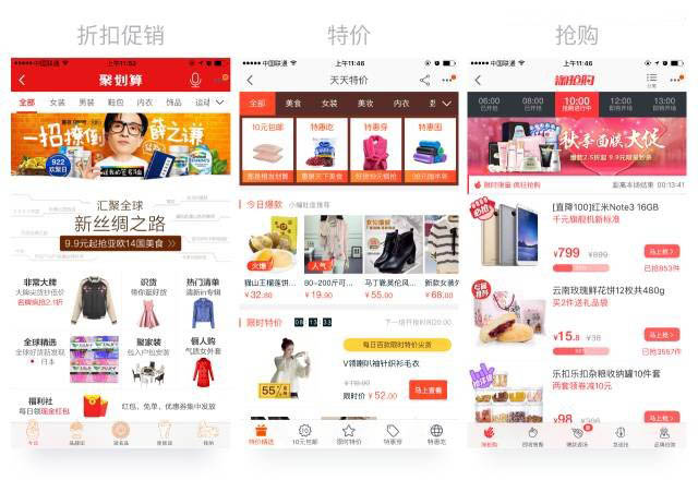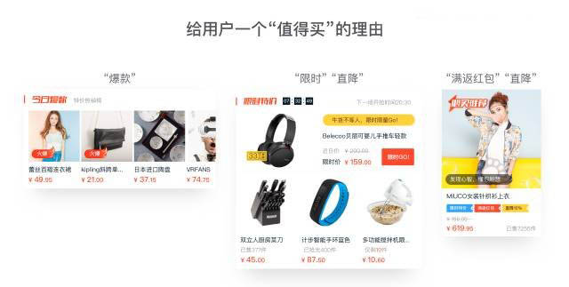 营销导购的竞争核心是“利”——购买商品的驱动力是价格;由平台将折扣、爆款、满减、降价、红包、优惠券等商品推送给用户,对用户的刺激购买是直接且有效的,营销导购的方式也有很多,比如折扣促销、特价、抢购等;