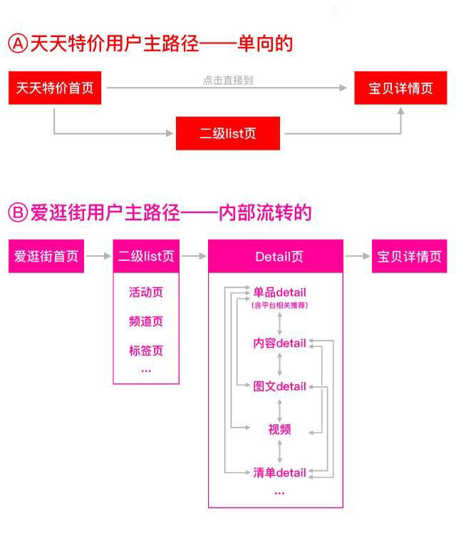以天天特价(营销导购)和爱逛街(内容导购)的用户主路径为例,可以看到此差别性: