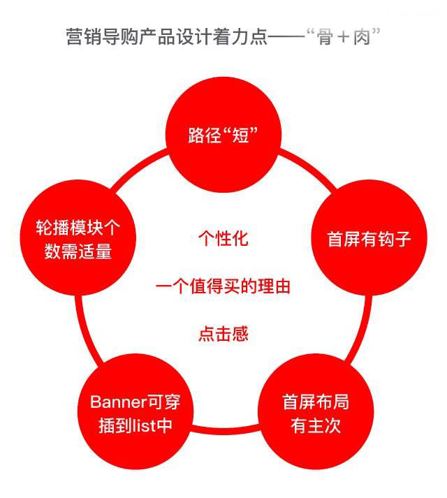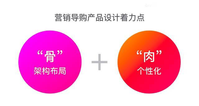营销导购产品设计着力于“骨”和“肉“,即架构布局和内容的个性化。在设计上采用合理的架构布局会提升产品数据和更加符合用户体验,而内容则是在架构基础上的填充,一个好的营销导购产品不仅要有合理的架构,更要有符合产品调性的商品、文案、设计、品牌等,综合”骨“和”肉“才是做好设计的抓手。