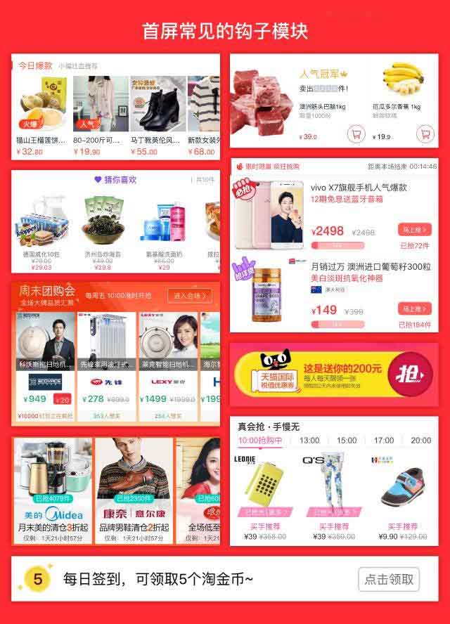 在这里指的是,在营销导购产品的首屏中通过价格优势、爆款、利益等维度吸引用户点击或回访的模块。产品中常用的钩子模块有:秒杀模块、今日爆款、人气冠军、抢红包、领金币、猜你喜欢、限时抢、整点抢购、必抢等,如下图。