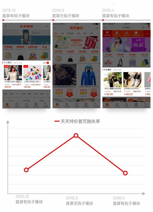 在天天特价产品实践过程中,如下图,从有今日爆款——拿掉今日爆款模块(基于简化首页内容)——拿回今日爆款模块,这个过程是基于简化首页内容、提升用户体验进行的优化,在有无钩子模块的情况下,首页跳失率(两周均值)上下波动明显(经过多角度分析排除其它原因干扰的可能性),可见,首屏的钩子模块能有效降低营销导购产品首页的跳失率。