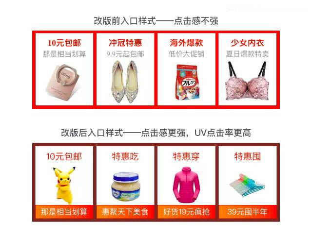 天天特价4个固定坑位设计优化考虑:突出利益点文案、设计样式强化点击感;结果表明能提升该模块的UV点击率;