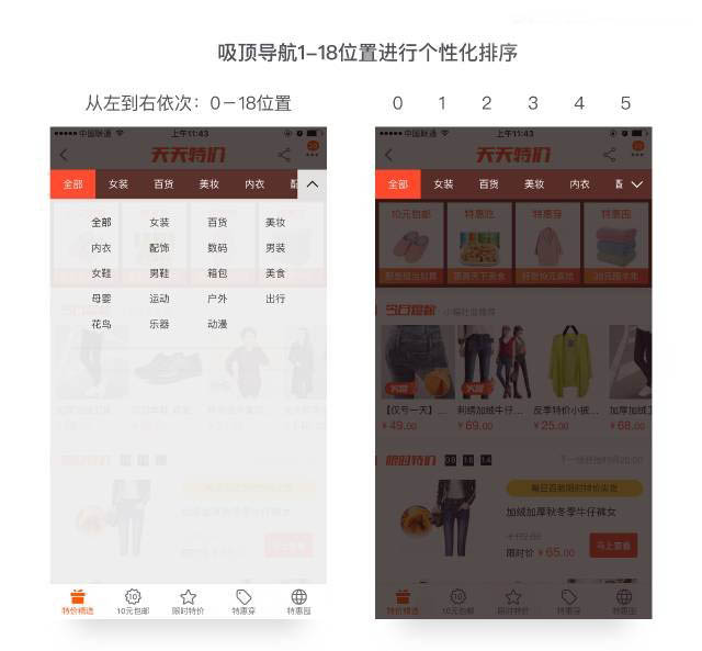 现代产品不论是从商品、价位、常去逛的频道、常去逛的类目等角度都需要为“一个用户而设计”,满足用户个体的不同需求。在这里讲一下吸顶导航类目的个性化,天天特价首页的吸顶导航有19个类目,一排只能展示5个,从用户体验出发对每个用户进行类目导航进行个性化算法,结论如下: