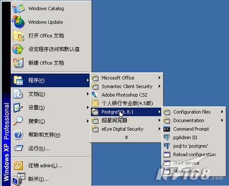 从开始菜单-->程序-->Postgresql 8.1-->pgAdmin III,如下图