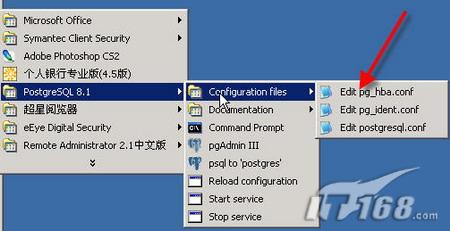 PostgreSQL出于安全考虑,默认是拒绝所有远程客户端的连接的,如果你要想远程登录服务器端的话,需要设置pg_hba.conf,从开始菜单-->程序-->Postgresql 8.1-->configuration files中选择编辑pg_hba.conf。