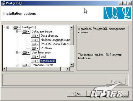 点下一步就是选择安装内容的选项了,其中分四大部分,分别是数据库服务器端、用户界面、数据库驱动和开发模块。你可以根据需要选择安装。笔者为了了解更多的东西,就把四部分全部装全了。另外此处要注意的是数据目录选项只能安装在NTFS格式的分区,如果你要安装在其他格式的分区的话,需要在安装完后,手动运行Initdb.exe。