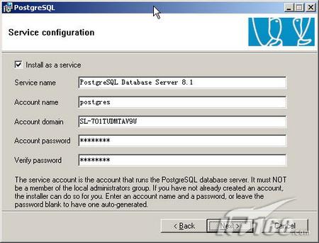 接下来是服务配置,你可以把该数据库服务器作为Windows的一个系统服务运行,这也是Postgresql开始真正支持Windows安装的一个体现(如下图)。
