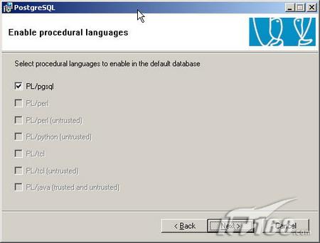 选择在默认创建的测试数据库template1中激活的过程语言,PL/perl需要ActiveState Perl 5.8的安装支持,PL/python则Python 2.3的支持,我这儿只选择了pgsql了。注意这个对话框只有你在选择了让PostgreSQL作为一个系统服务运行,并且选择了初始化数据库组件后才会出现。