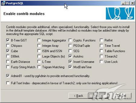 选择在测试数据库template1中激活的模块,所有的扩展文件都是会被安装上,这一步只是选择在你所有的数据库中默认激活哪些模块。这些扩展模块能提供一些增强的功能。