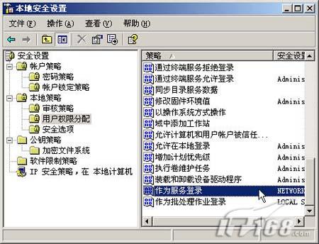 在运行框内输入“secpol.msc”打开“本地安全设置”窗口,依次点击“本地策略”-“用户权限分配”,在右边窗口里找到“作为服务登录”,双击打开。