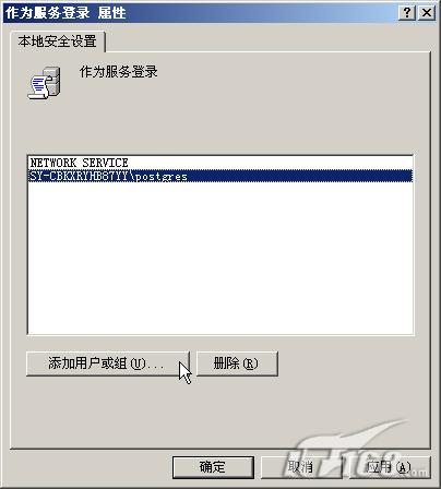 在出现的窗口里单击“添加用户或组”添加一个名为“postgres”的用户。