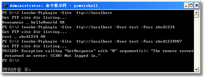 在PSNet程序集中继续进行扩展,在$env:PSSpace/PSNet/TCPOp/下创建名为Invoke-FtpLogin.ps1的脚本用于在传入指定ftp地址、用户名和密码后返回是否登录成功。