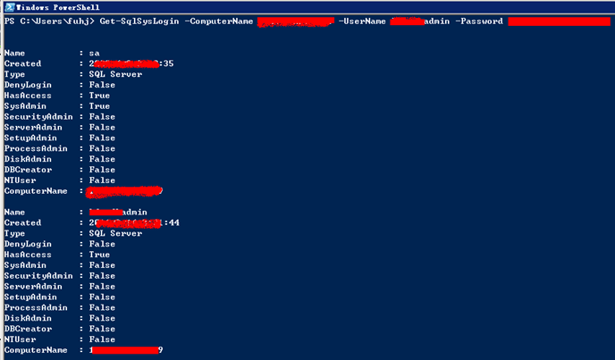} | Select-Object Name, Created, Type, DenyLogin, HasAccess, SysAdmin, SecurityAdmin, ServerAdmin, SetupAdmin, ProcessAdmin, DiskAdmin, DBCreator, NTUser, ComputerName