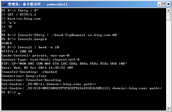 $http | .\Send-TcpRequest cn.bing.com 80