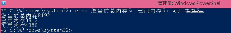 #made by kukisama $a=(get-wmiobject -class Win32_PhysicalMemory -namespace "root\cimv2").Capacity $b=(get-wmiobject -class Win32_PerfFormattedData_PerfOS_Memory -namespace "root\cimv2").AvailableMBytes $c=$a/1024/1024 $d=$c-$b cls echo 您当前总内存$c 可用内存$b 已用内存$d