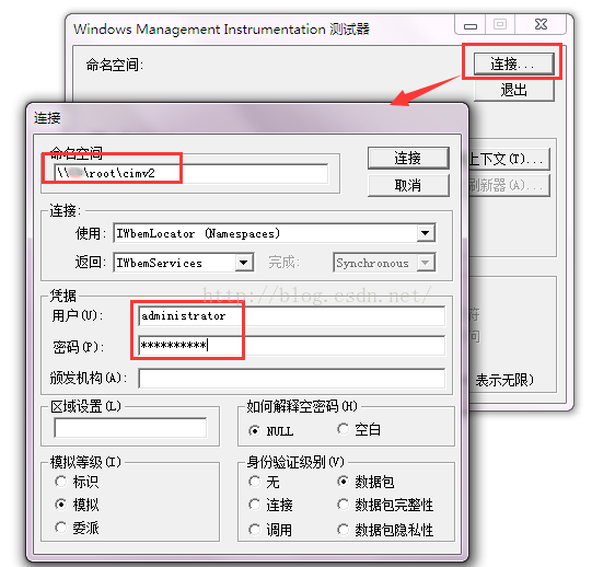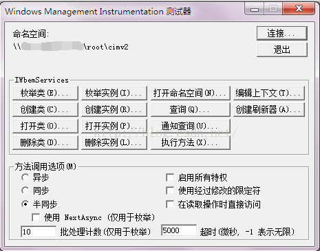 远程启用开启之后可以在cmd命令窗口输入wbemtest测试是否可以连接远程服务器,如图: