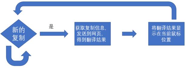 我的想法是一旦发现我复制就可以在当前鼠标位置显示一个翻译结果框。基于这个想法,我一开始准备使用MFC编写,因为MFC能够轻易获得系统消息,钩子调用十分简单。可是我把检测复制,显示文本框都做好的时候,发现一个悲伤的事实,c++的http库实在是不怎么样,竟然无法访问http://地址,经过一晚的尝试——失败,这才打算使用python。啰啰嗦嗦一大堆,我现在把我的逻辑说下吧。