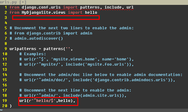 我们为urlpatterns加上一行: (r‘^hello/$', hello), 这行被称作URLpattern,它是一个Python的元组。元组中第一个元素是模式匹配字符串(正则表达式);第二个元素是那个模式将使用的视图函数。