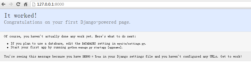 到这为测试成功。到这里python Django web开发环境基本通了。