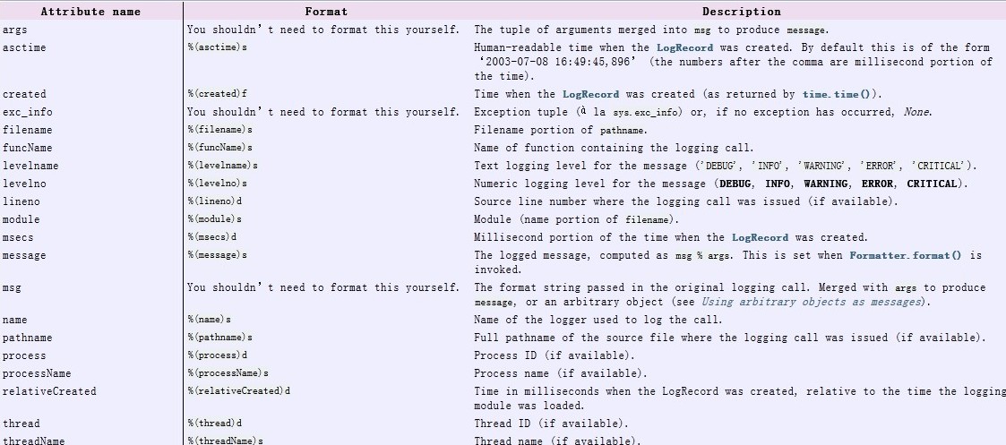 fmt参数指定进程号、文件名、函数名等信息是否出现以及格式, datefmt为日期时间格式,默认的日期格式精确到微秒,例如‘2003-07-08 16:49:45,896'。fmt中可以指定多个字段,每个字段的格式为“%(<dictionary key>)s”, 例如你想打印时间、日志级别、日志信息可以用下面的format: