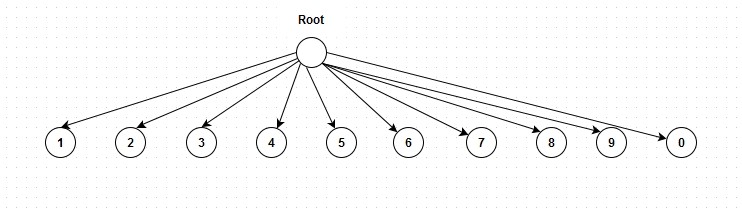 整个实现包括2个类:Trie类和Node类。Node类表示Trie树中的节点,由Trie类组织成一棵Trie树。我们先来看Node类: