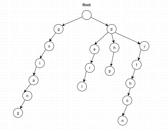 Node包含三个成员变量。c为每个节点上存储的字符。word表示一个完整的词,在本文中指的是一个字符串。childs包含这个节点的所有子节点。既然在每个节点中存储了c,那么存储word有什么用呢?并且这个word应该存在哪个节点上呢?还是用刚才的图举例子:比如go和golang,它们共用go前缀,如果是字符串搜索倒好办,因为会提供原始字符串,只要在这棵Trie树上按照路径搜索即可。但是对于排序来说,不会提供任何输入,所以无法知道单词的边界在哪里,而Node类中的word就是起到单词边界作用。具体是存储在单词的最后一个节点上,如图所示: