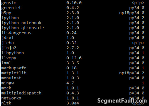 conda的repo中的扩展不算太新,如果想要更新的,可能要用PyPI或者自己下载源码。而conda和pip关联的很好。使用pip安装的东西可以使用conda来管理,这点要比Canopy好。下图是我用pip安装的 nltk , jieba 和 gensim 。