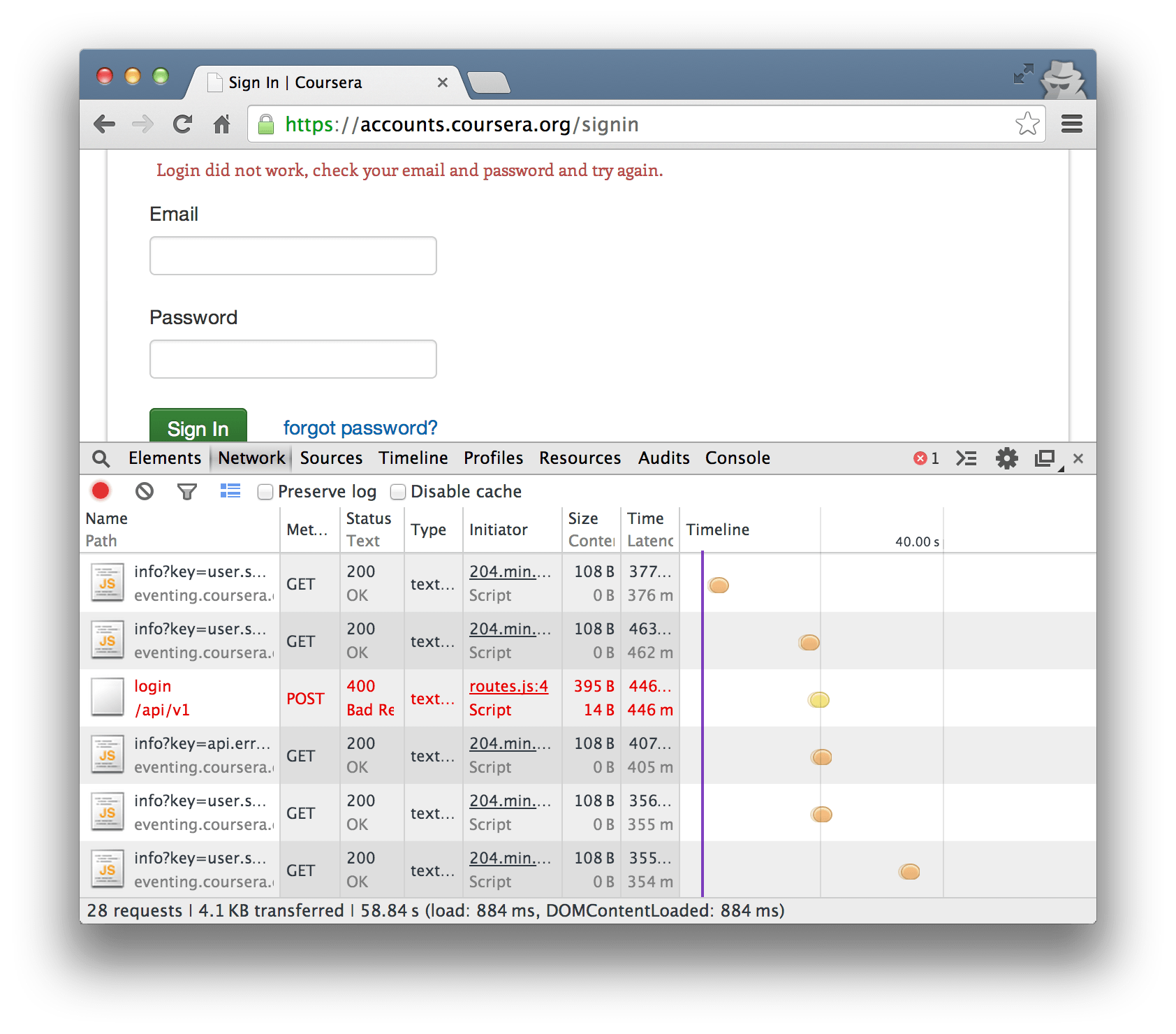 地址为:https://accounts.coursera.org/api/v1/login。为了知道向服务器提交了哪些内容,进一步观察post页面中表单中内容,如下图: