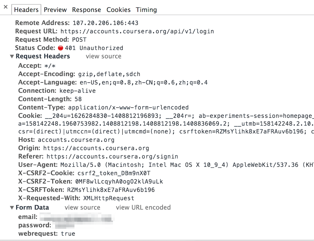 上面片段的运行结果很奇怪,显示如下信息:Invalid CSRF Token。后来在github上面搜索到一个Coursera的批量下载脚本,发现人家发送页面请求时headers多了XCSRF2Cookie, XCSRF2Token, XCSRFToken, cookie4个字段。于是又重新看了一下post页面的请求头部,发现确实有这几个字段,估计是服务器端用来做一些限制的。