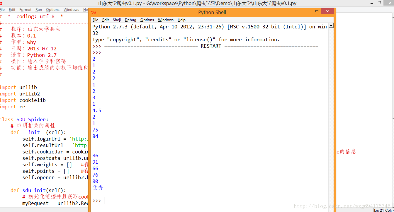 首先,我们POST学号和密码--->然后返回cookie的值然后发送cookie给服务器--->返回页面信息。获取到成绩页面的数据,用正则表达式将成绩和学分单独取出并计算加权平均数。