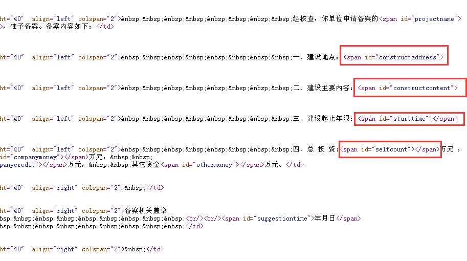 由源码可以看出,这个《备案确认书》属于“填空”形式的,HTML提供文字模板,js根据不同的id提供不同的变量,“填入”到文字模板中,形成了一个具体的《备案确认书》。所以单纯抓取此HTML,只能得到一些文字模板,而无法得到具体内容。