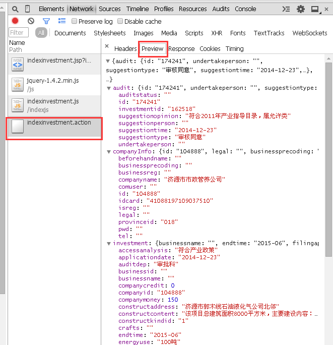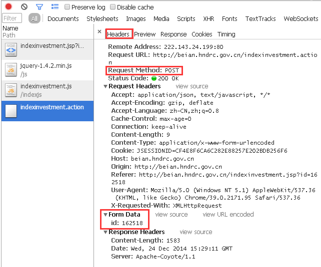 那么,参数是多少呢?URL上有,是“jsp?id=162518”,问号表示要调用参数,后面跟的是id号即是被调用的参数。而通过对这几个文件的分析,很显然,企业信息存在于“indexinvestment.action”文件中。