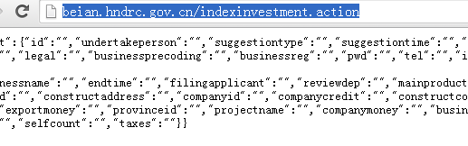 但是,在动态页面中,所显示的内容往往不是通过HTML页面呈现的,而是通过调用js等方式从数据库中得到数据,回显到网页上。以发改委网站上的“备案信息”(http://beian.hndrc.gov.cn/)为例,要抓取此页面中的某些备案项目。例如“http://beian.hndrc.gov.cn/indexinvestment.jsp?id=162518”。