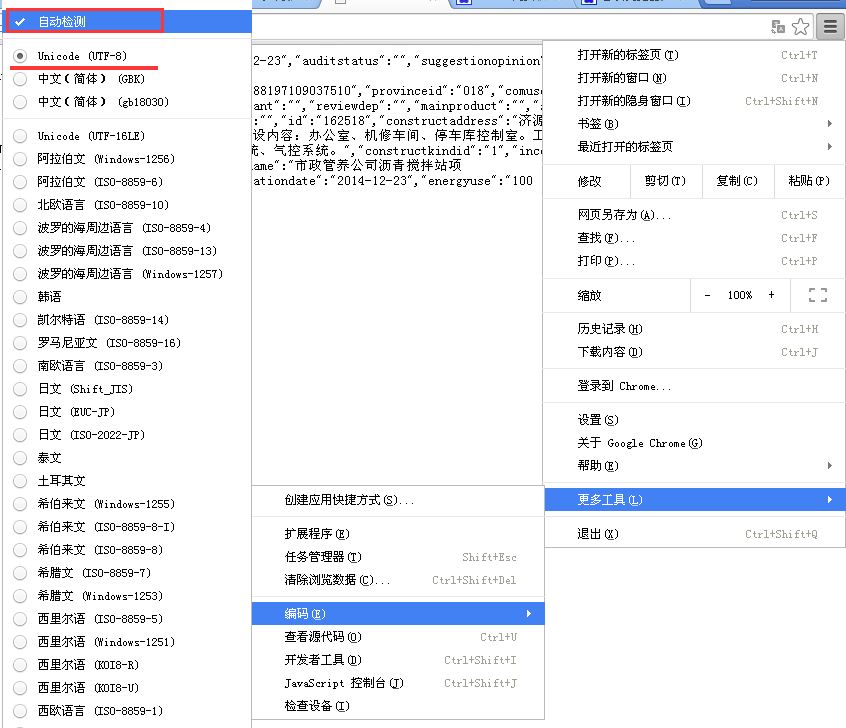 似乎有了点内容,可是都是乱码啊,怎么破?熟悉的朋友可能一眼就看出来,这是编码的问题。是因为响应回来的内容与浏览器默认的编码方式不同。只需要在Chrome右上角菜单——更多工具——编码——“自动检测”即可。(其实这是UTF-8的编码,而Chrome默认的是中文简体)。如下图: