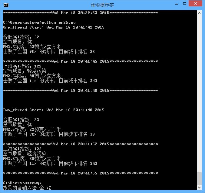 t1 = threading.Thread(target=getPM25,args=('hefei',))