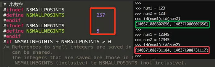 >>> a = -5 >>> b = -5 >>> id(a),id(b) (8745920, 8745920) >>> a = -6 >>> b = -6 >>> id(a),id(b) (140718131946128, 140718131946320) >>> aa=256 >>> bb=256 >>> id(aa),id(bb) (8754272, 8754272) >>> aa = 257 >>> bb = 257 >>> id(aa),id(bb) (19083048, 18637656)